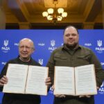 Глава Верховной Рады Руслан Стефанчук и инициатор межпарламентской сети U4U Андрюс Кубилюс подписали «Декларацию единства ради европейской Украины»