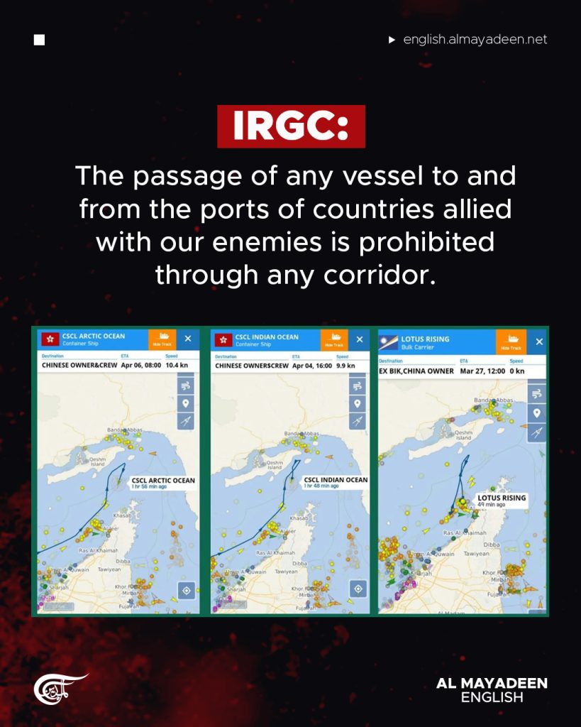 «Проходження будь-якого судна до або з портів, що належать союзникам і прихильникам ворогів, заборонено, незалежно від пункту призначення або коридору, — зазначають у ВМС КВІР.