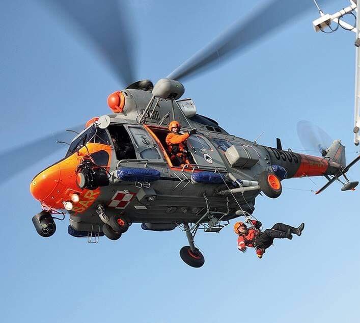 Через висоту робочих платформ рятувальникам довелося задіяти гелікоптер W-3WARM Морської авіаційної бригади ВМС Польщі. О 14:43 постраждалого підняли на борт і доставили до аеропорту Дарлово, де його передали медикам.