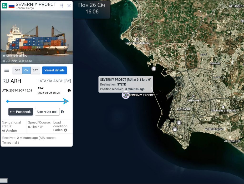 Судно Severniy Proect (IMO:9202053) здійснив прямий рейс з окупованого Севастополя в сирійський порт Латакія.