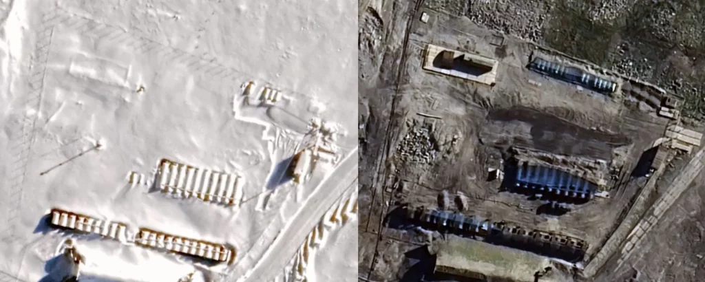 Серпневі знімки Google Earth (14 серпня 2025) зафіксували три ряди паливних резервуарів біля поселення Північний на архіпелазі Нова Земля, вкритих блакитними металевими сітками — тими самими «захисними клітками», які раніше застосовувалися для покриття авіаційних паливних баків на російських військових аеродромах.