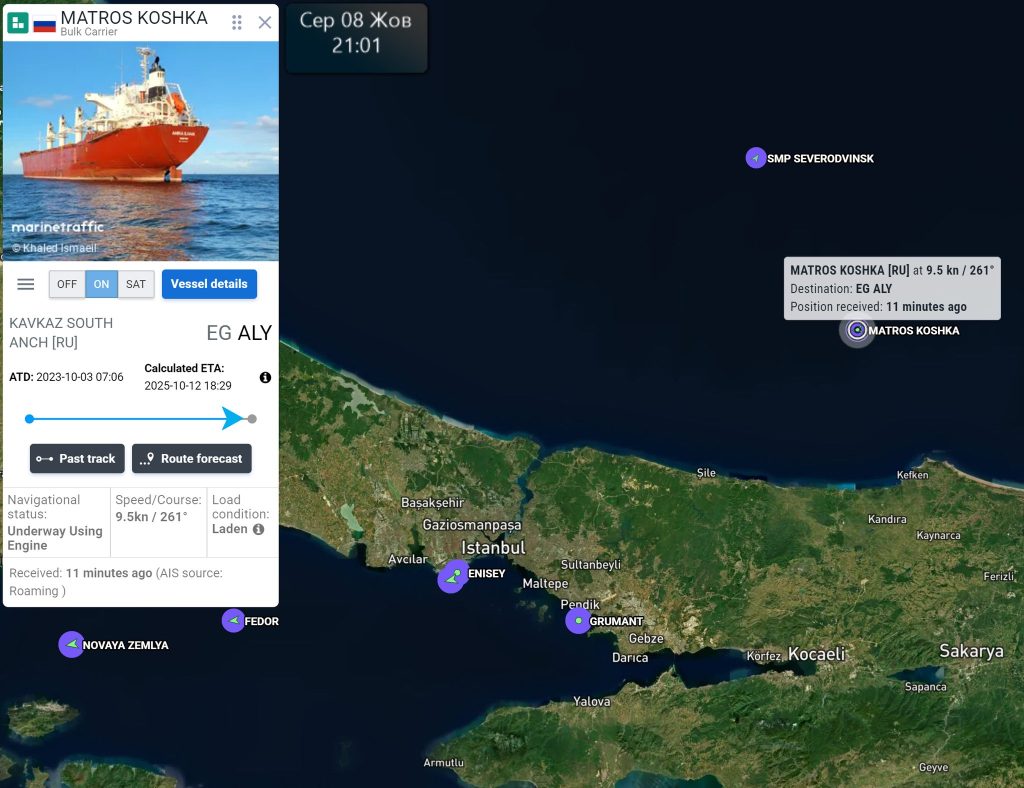 На судні Matros Koshka під прапором РФ перевозять понад 27 тис. тонн краденого зерна. Ймовірно, збіжжя доставлять до Сирії.