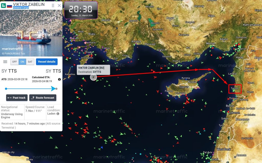 Вантажне судно Viktor Zabelin (IMO:9210256), яке перебуває під санкціями, завантажило сталевий прокат у Криму і прямує в Сирію.