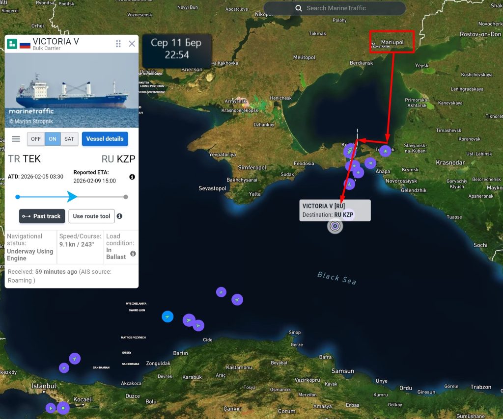 «Завантажене судно вийшло з окупованого Маріуполя і зайшло в порт Темрюк для оформлення документів, без вантажних операцій 03-05.03.2026. Порт призначення: Александрія (Єгипет)», — розповіла Катерина Яресько.