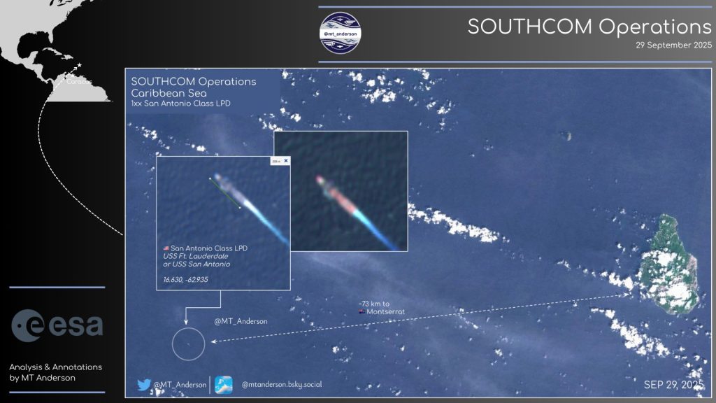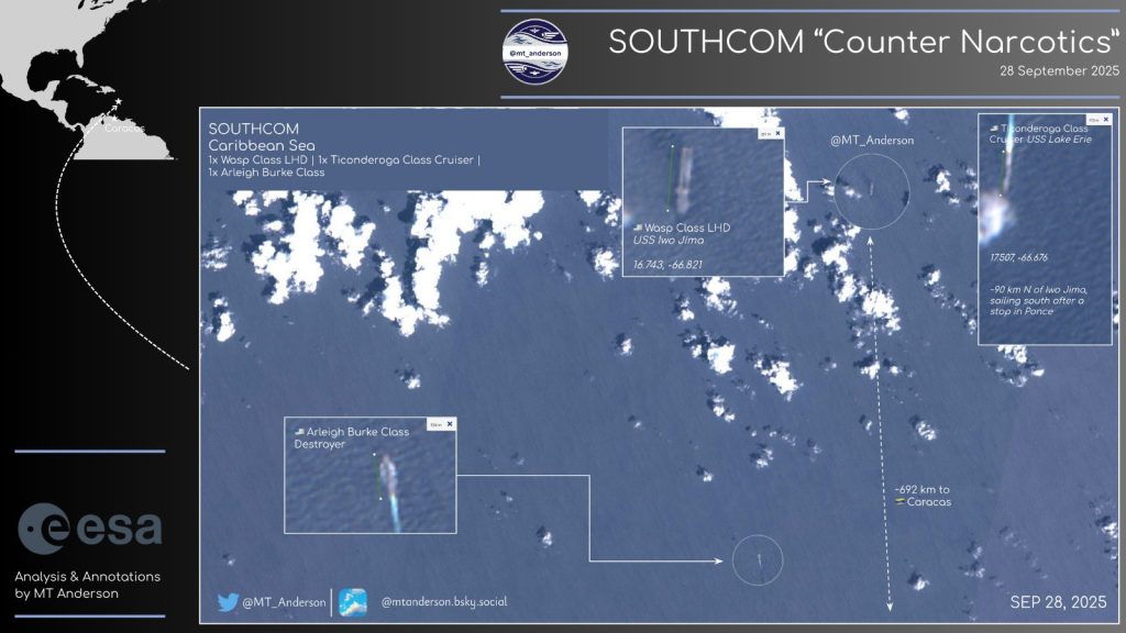 Серед зафіксованих суден — універсальний десантний корабель USS Iwo Jima (LHD-7) типу Wasp, помічений за 70 км на захід від острова Монтсеррат, а також десантний транспорт-док класу San Antonio. Обидва використовуються для перевезення експедиційних сил морської піхоти США.