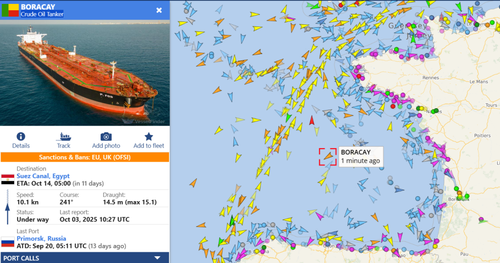 Танкер Boracay відновив свій шлях до Суецького каналу, повідомляє «Бабель» із посиланням на Marine Traffic і Vesselfinder.