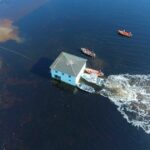 Отмечается, что во время транспортировки дом накренился и начал тонуть. Чтобы спасти имущество пришлось задействовать еще несколько лодок. Сейчас дом находится в Нижней бухте города Макиверс. Его установят после заливки фундамента.