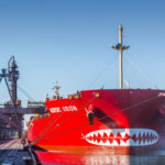 Носовая часть сухогруза украшена рисунком улыбающейся пасти акулы. Как для грузового судна, такой дизайн выглядит необычно. Гораздо чаще изображения наносятся на корпуса пассажирских лайнеров.