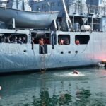 В Практической гавани Одессы состоялось показательное корабельное боевое обучение Военно-морских сил по покиданию аварийного корабля.