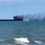 Возле порта Темрюк (рф) в Азовском море загорелось торговое судно.