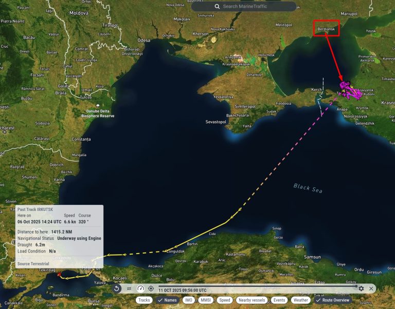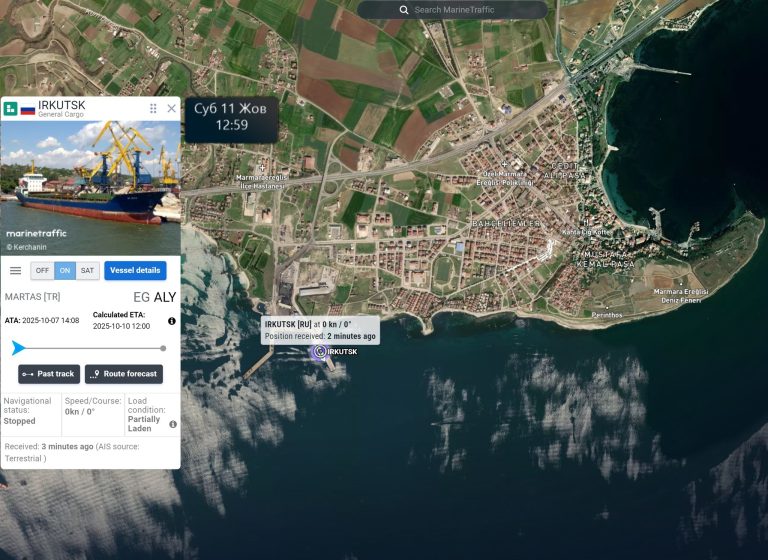 Також судно Irkutsk (IMO:9419084) завантажило в окупованому Бердянську з 20 по 23 вересня 7063 тонн пшениці, оформило документи в Темрюку і 7 жовтня доставило зерно в порт Мармара.